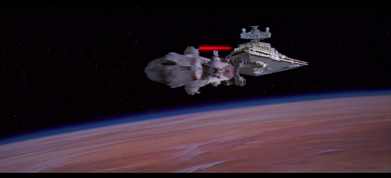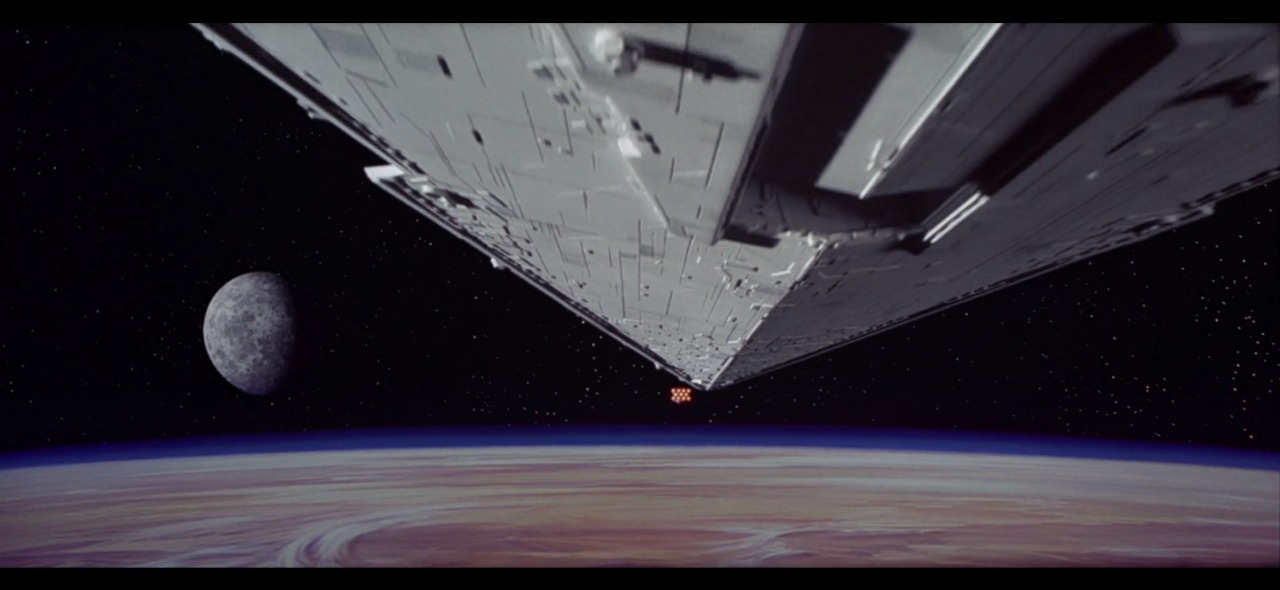 Je ziet eerst het rebellenschip voorbij vliegen en daarna de gigantische Star Destroyer die maar blijft komen en steeds groter wordt en de rebellen steeds kleiner. De camera staat hier ook onder het schip en beweegt niet. Zonder nog maar één woord gezegd te hebben weet de kijker dat het kleine rebellenschip geen schijn van kans maakt tegen de Star Destroyer en de dreiging van de Empire. Het plot is in gang gezet enkel door deze twee geniale shots.