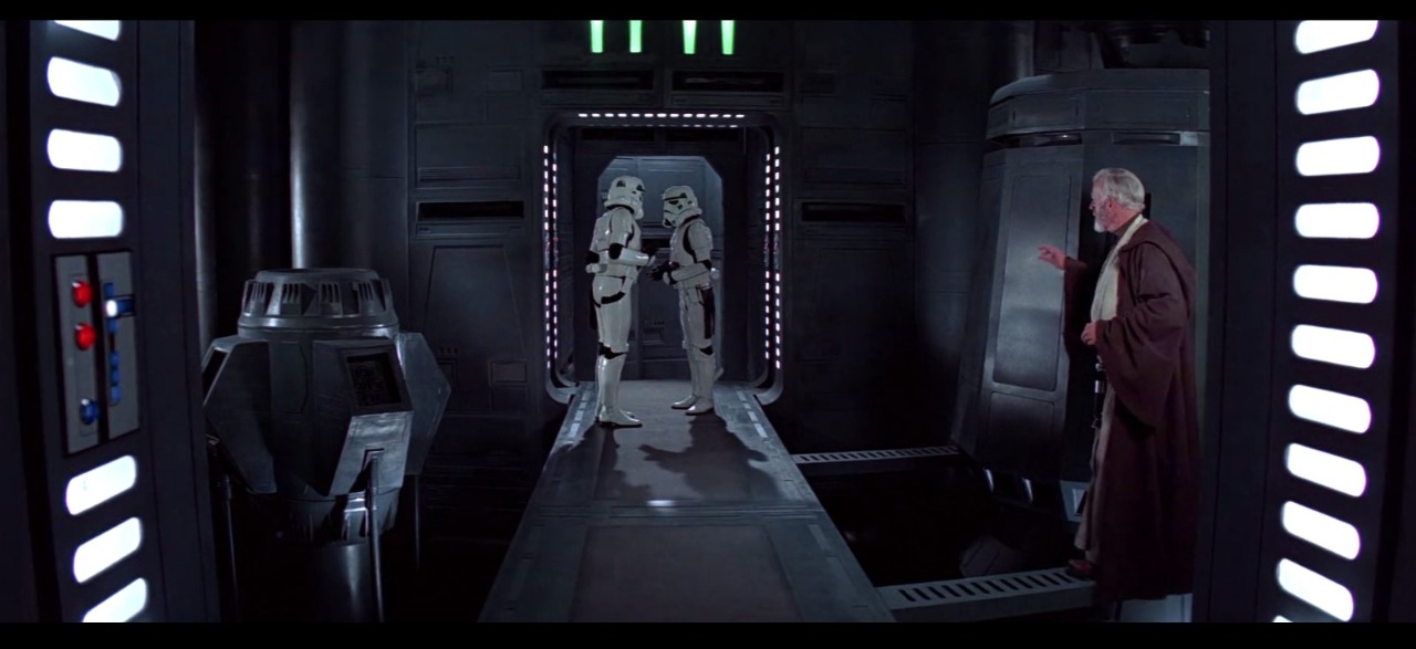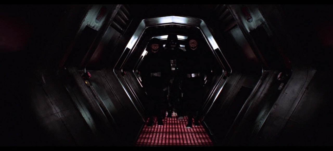 Darth Vader loopt in het midden. Voor hem lopen twee soldaten. Ook de lange hal is aan beide muren hetzelfde, inclusief de rode knoppen en de strepen op de vloer. Let hier ook weer op het gebruik van scherpe hoeken.