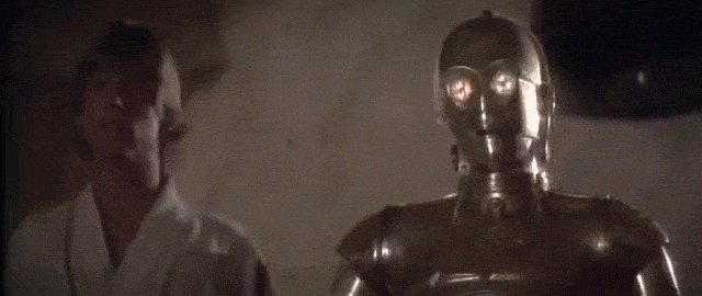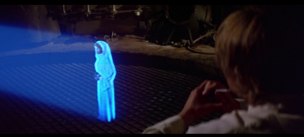 We kijken mee met Luke Skywalker naar de Hologram van prinses Leia. Luke schrikt zich een ongeluk wanneer de hologram eerst verschijnt. Al gauw kijkt hij met open mond naar de prachtige vrouw.