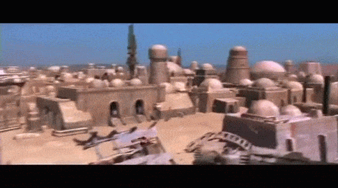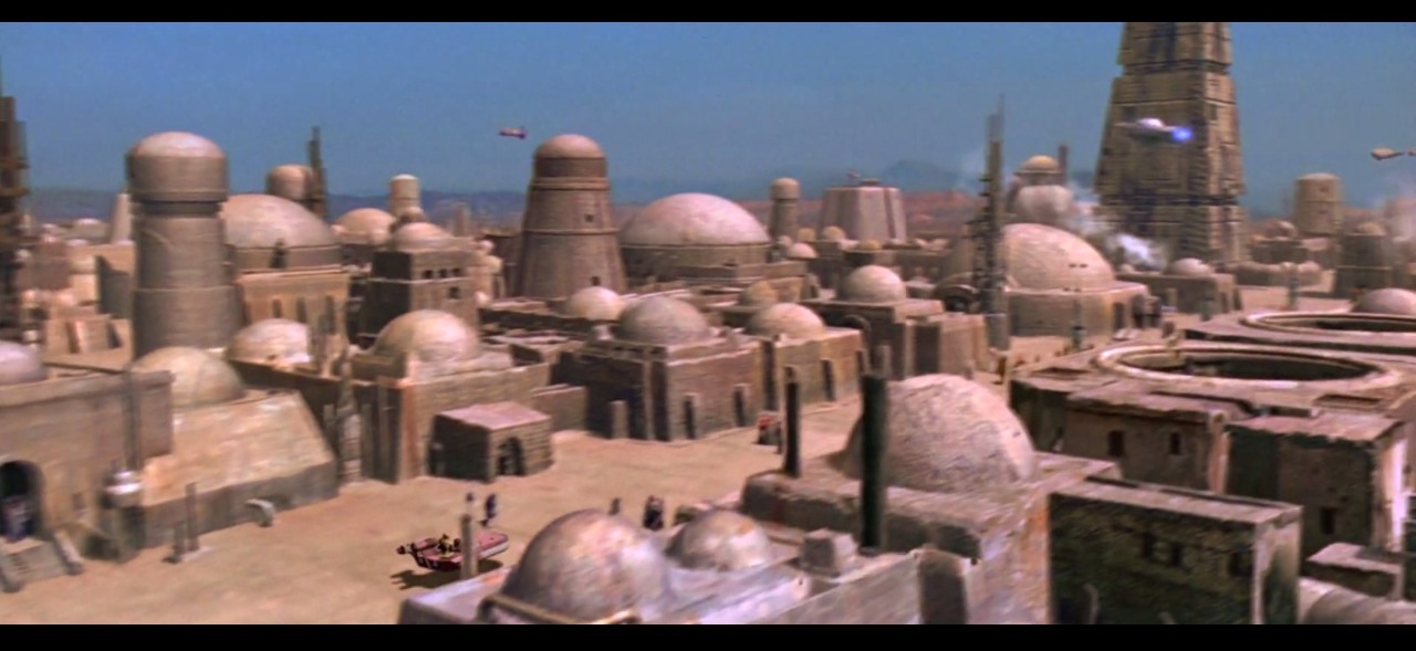 Luke en Obi-Wan komen aan in het gedeelte op tatooine waar ze een schip en piloot kunnen huren, Mos Eisley. Zodra het schip de stad bereikt stopt de camera met het schip te volgen en maakt het een opwaartse beweging. We krijgen een vogelperspectief van de drukke levendige stad die leeft van voornamelijk (illegale) handelspraktijken.