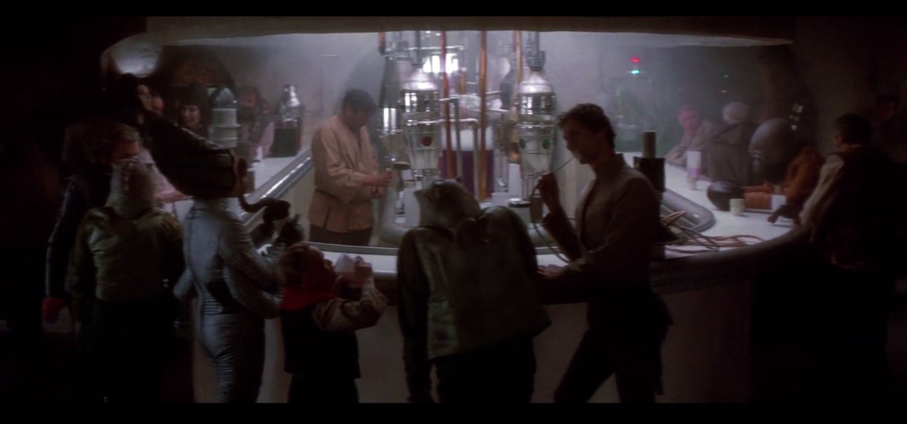 Wanneer Luke en Obi-Wan opzoek gaan naar een piloot met schip stappen ze de Mos Eisley Cantina binnen. Hier komt al het schorriemorrie samen. Luke is zo verbaast als wat wanneer hij voor het eerst de kantine betreed. Dit wordt weergeven in een camerabeweging die traag de gehele ruimte filmt (van links naar rechts). Luke kijkt verward en wat verloren rond in de kantine wachtend op een positief teken van Obi-Wan.