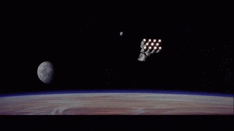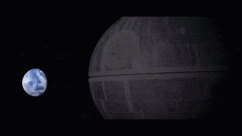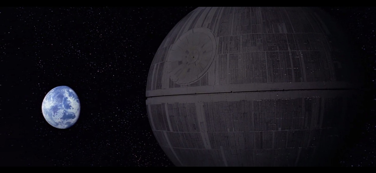 Hier zoomt de camera uit op de Death Star en de planeet Alderaan. De Death Star wordt hier groter vertoond dan de planeet door het camerastandpunt. Dit om aan te tonen hoe groot en machtig de Death Star is en in het verlengde ook de Empire. De Death Star draait zichzelf zodat de straal gericht zal staan op de planeet. Niet veel later wordt Alderaan opgeblazen vlak voor prinses Leia’s ogen.