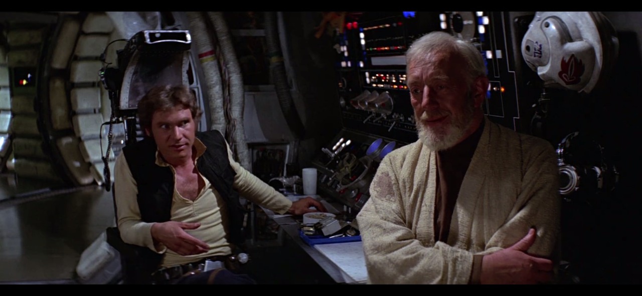 Het is een rommelige omgeving binnenin het schip. Draden en kabels hangen los, zijn bureau is een zootje en overal liggen er spullen in het rond. Let ook op de vuile helm naast Obi-Wan.