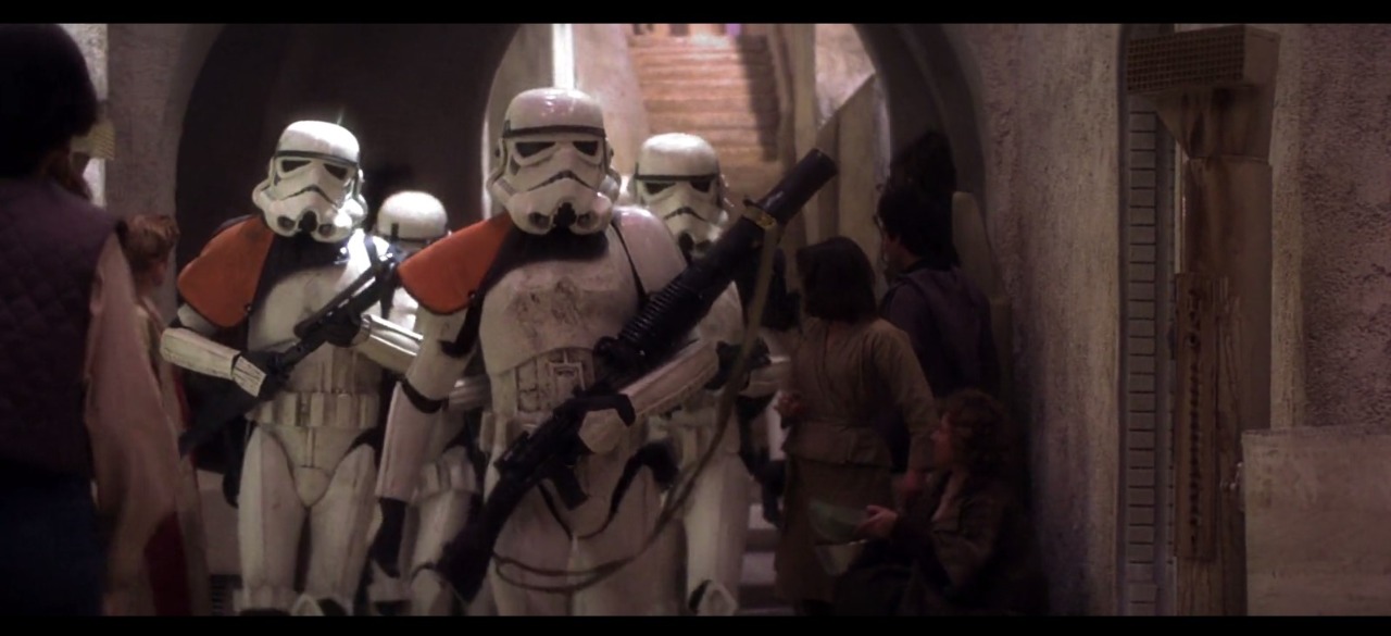 De uniformen van de Stormtroopers zijn smerig. Ze lopen door een van de vele smalle gangetjes van Mos Eisley op zoek naar Han Solo. Tatooine is een planeet met grotendeels woestijngebieden. Er zijn dus ook geen verharde wegen, maar alleen zand en vuiligheid.